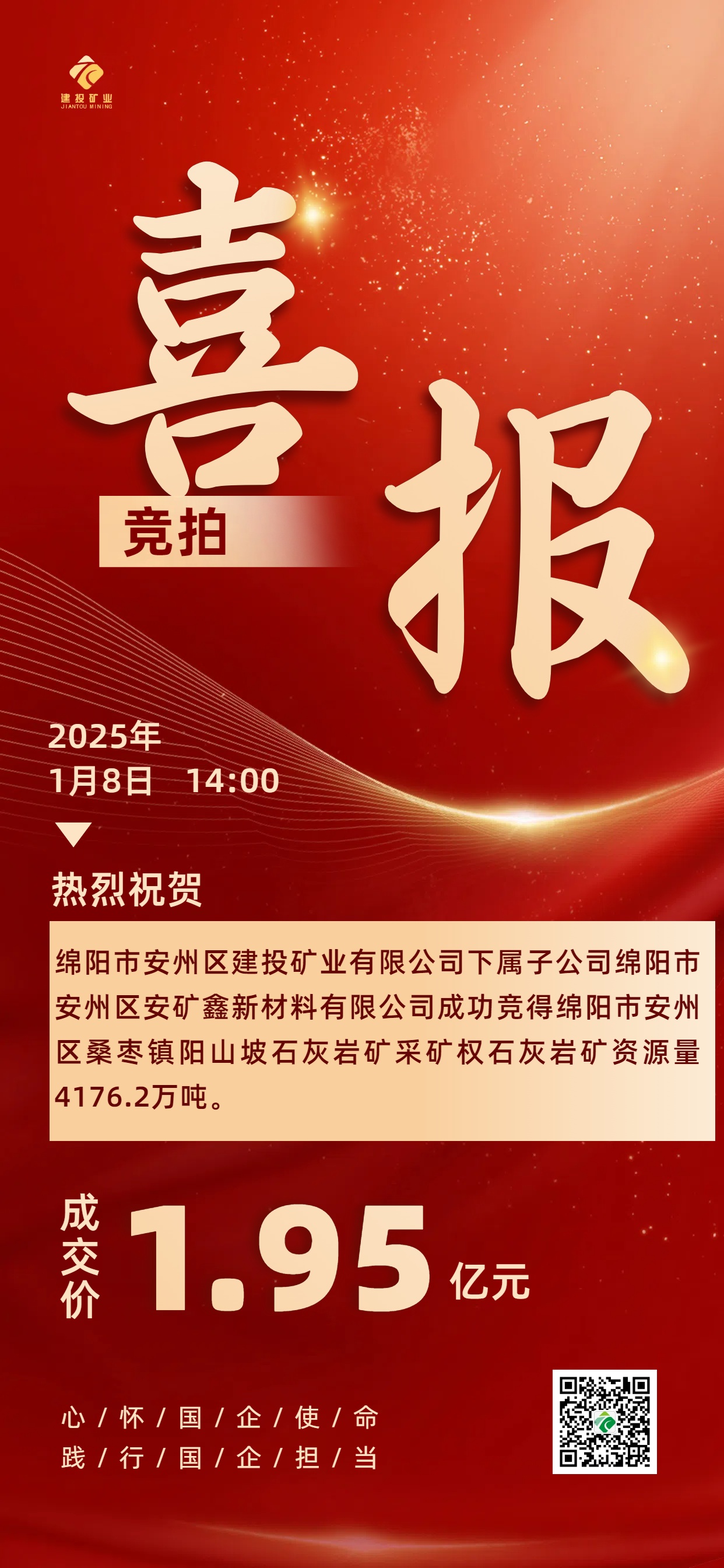 喜報|綿陽安州礦產(chǎn)資源集團有限公司下屬子公司綿陽市安州區(qū)安礦鑫新材料有限公司成功競得綿陽市安州區(qū)桑棗鎮(zhèn)陽山坡石灰?guī)r礦采礦權